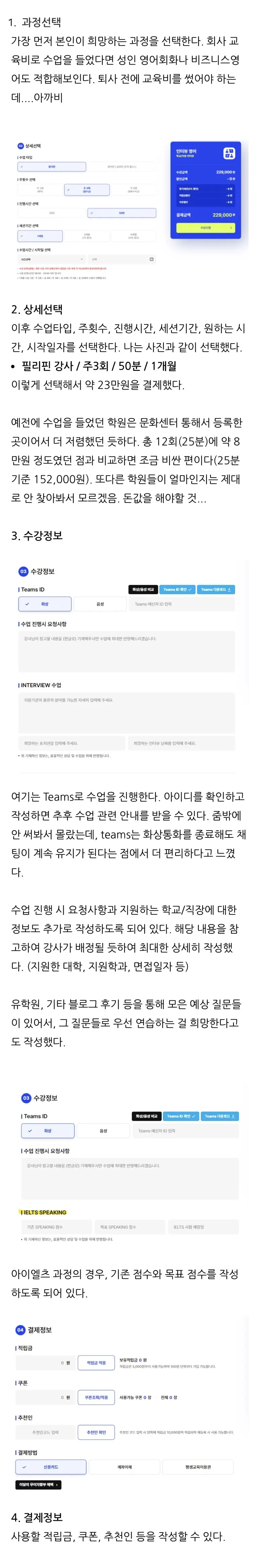 수강신청 단계부터 아이엘츠스피킹, 성인 회화, 직장/학교 면접 등으로 코스가 세밀하게 나뉜 점에 신뢰를 느끼셨대요. 본인의 목적에 딱 맞는 강사님이 배정될 것이라는 기대가 실제 수업 만족도로 이어졌습니다.