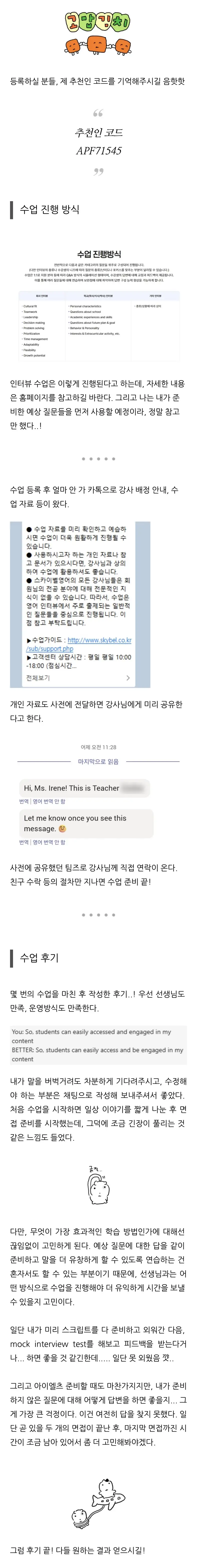 저희 스카이벨화상영어는 여러분의 소중한 기회가 합격으로 이어질 수 있도록 가장 든든한 파트너가 되어 드릴게요. 대학원면접이나 취업 등 중요한 인터뷰준비를 앞두고 실전 감각이 절실하신 분들께 이번 화상영어후기가 좋은 가이드가 되길 바랍니다!