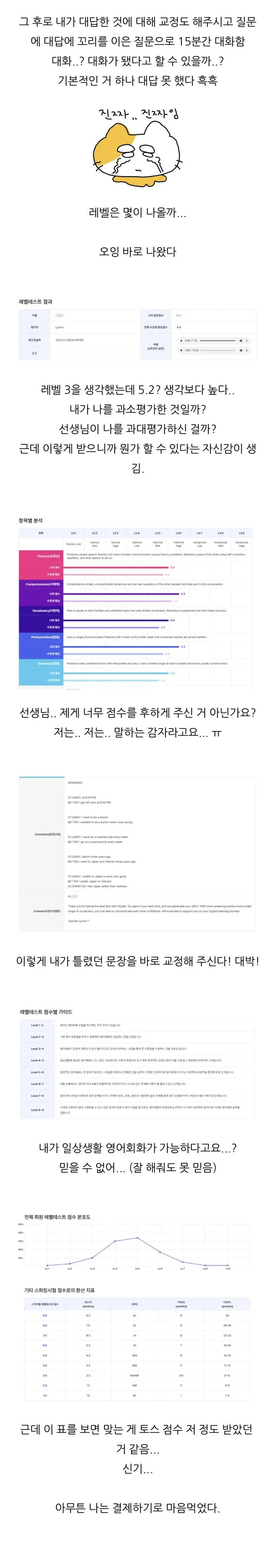 딤디님 유투브의 영상을 보고 용기를 내어 저희 문을 두드려주셔서 정말 반갑습니다. 홍당무처럼 얼굴이 빨개질 정도로 긴장하셨으면서도, 끝까지 대화를 이어가며 5.2라는 놀라운 성적을 거두신 회원님의 잠재력에 박수를 보냅니다!