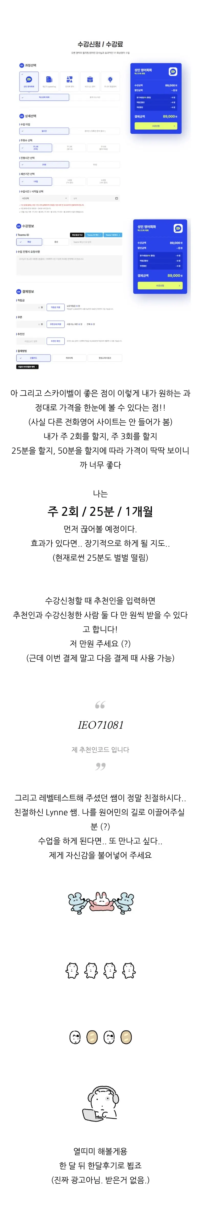 주 2회 25분, 부담 없는 시간부터 차근차근 시작하시려는 계획이 아주 좋습니다. 수강료를 한눈에 비교할 수 있어 결정이 더 빠르셨을 텐데요. 추천인 코드 혜택까지 알뜰하게 챙겨서 다음 결제 때 만 원의 행복도 꼭 누려보시길 바랍니다!