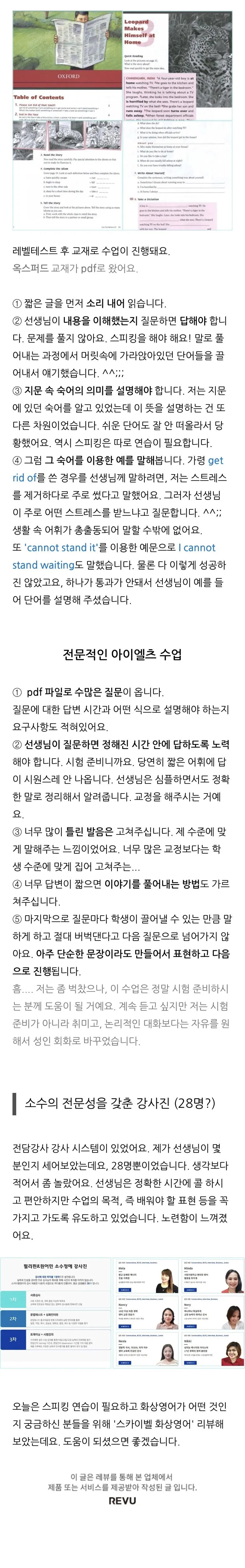 소수 정예 강사 시스템에 놀라셨죠? 인원수가 적은 만큼 강사 한 분 한 분의 품질 관리가 철저하고 전담 강사제도가 잘 정착되어 있습니다. 정확한 시간 엄수는 물론, 편안한 분위기 속에서도 그날의 학습 목표를 반드시 달성하게 만드는 노련함이 화상영어의 몰입도를 높여주었습니다.