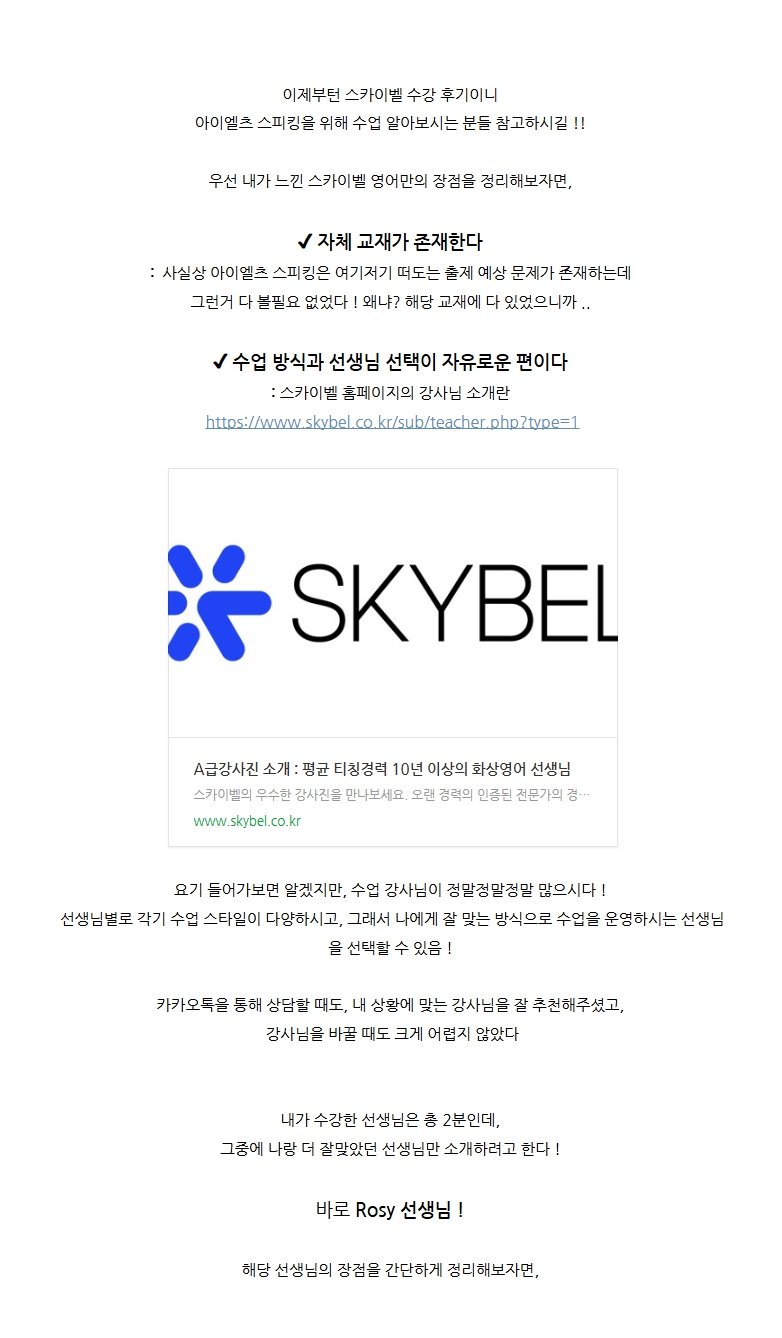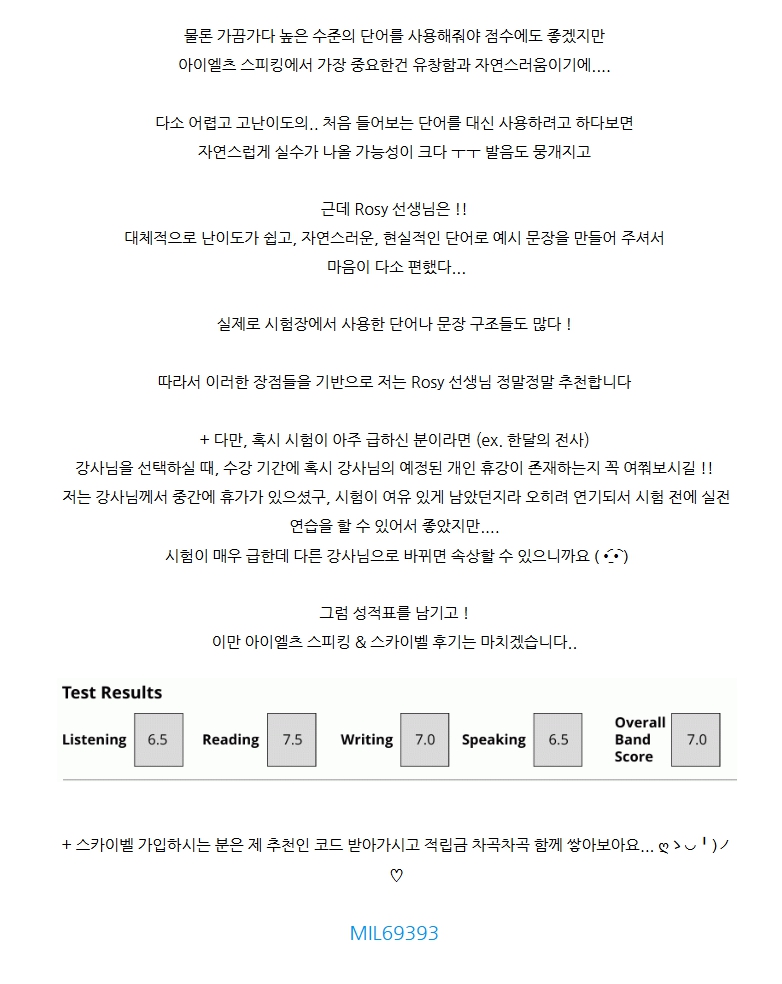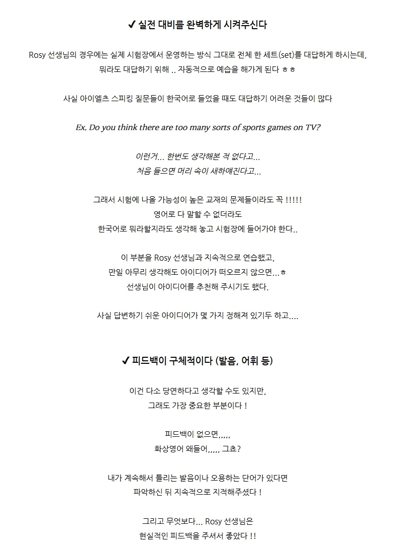 Rosy 선생님과 수업하셨는데, IELTS Speaking 실제 시험처럼 세트 전체를 한꺼번에 답변하는 연습을 하셨대요. 강제로라도 예습을 하게 만드는 환경이 실력 향상의 비결이었다고 하네요.