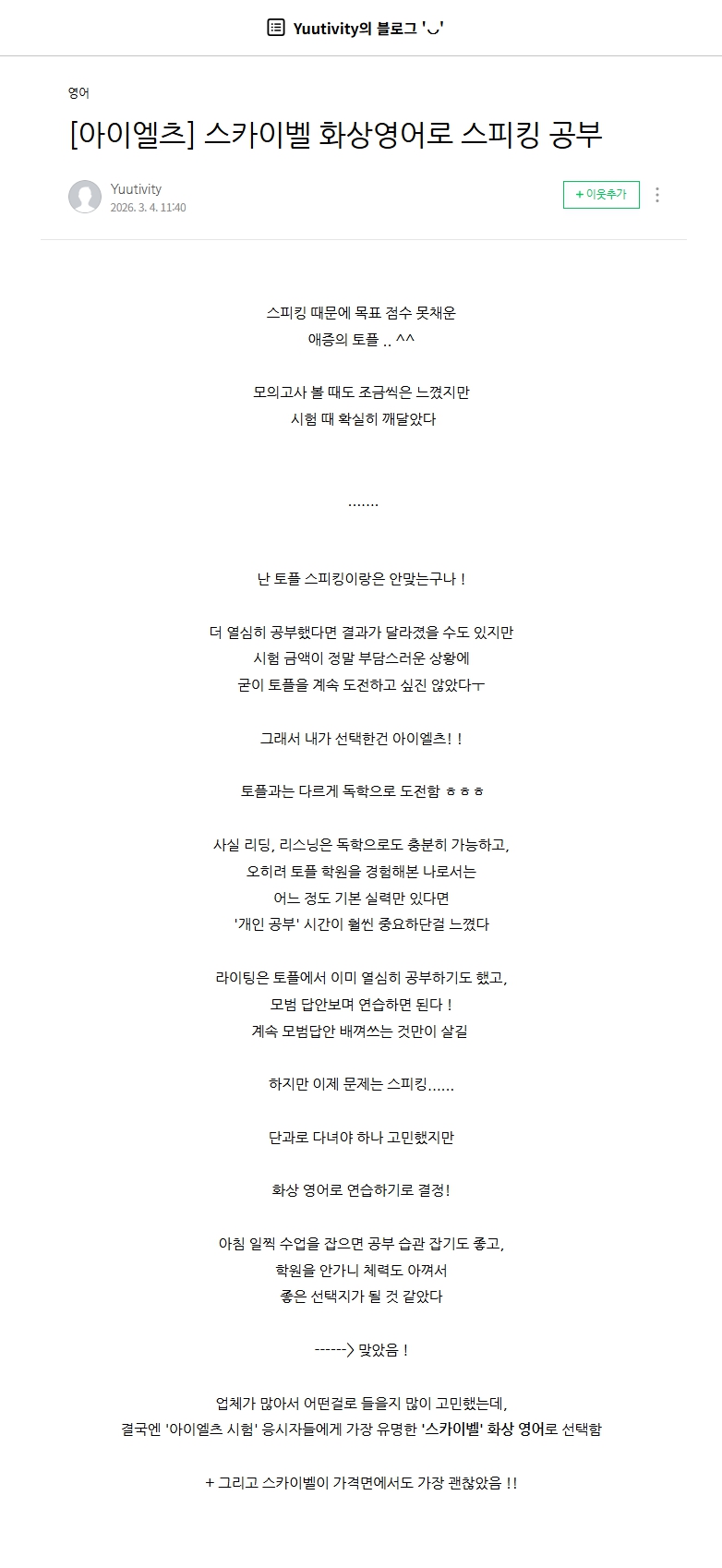 시험장에서는 긴장해서 어려운 단어를 쓰려다 오히려 꼬이기 쉽죠. 대신 입에 잘 붙고 자연스러운 표현 위주로 피드백을 받은 게 실제 고득점으로 이어졌다고 합니다.