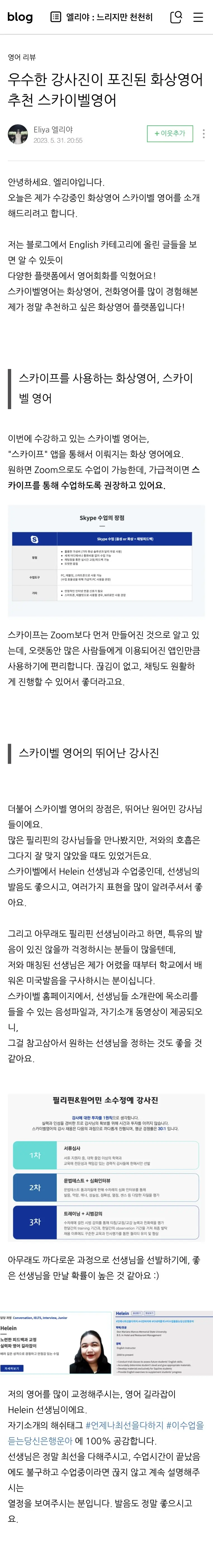 자기소개 해시태그처럼 언제나 최선을 다하시는 Helein 강사님은 수업 시간이 끝났음에도 열띤 설명을 이어가실 정도로 열정적이십니다. 특히 필리핀 강사님에 대한 편견을 깨는 유창한 미국식 발음과 세련된 표현 전수는 회원님께 큰 만족을 드리고 있습니다. 홈페이지의 음성·영상 프로필을 통해 나에게 꼭 맞는 선생님을 직접 선택할 수 있다는 점이 큰 장점이죠!
