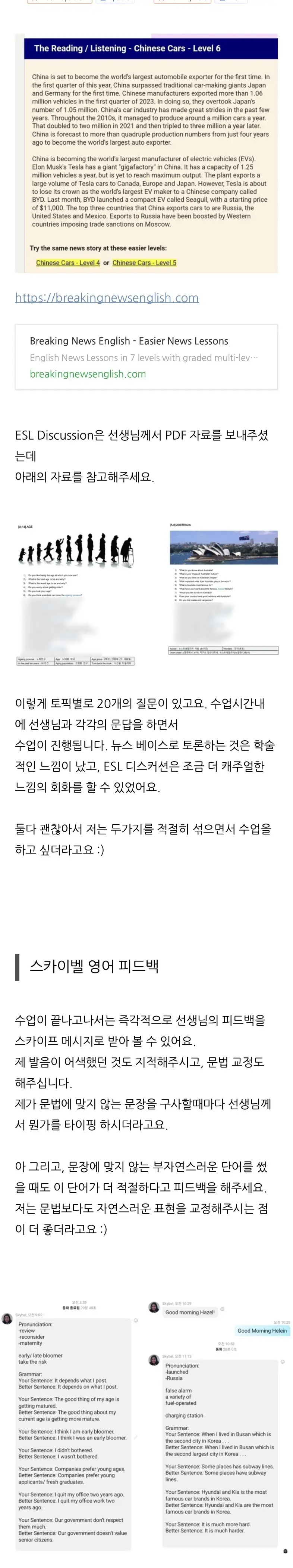 회원님은 Breaking News English를 활용한 시사 토론과 ESL Discussion의 캐주얼한 회화를 적절히 섞어 수업하고 계세요. 학술적인 문장 구조와 일상적인 자연스러움을 동시에 잡을 수 있는 전략적인 선택입니다. 선생님이 직접 공유해주시는 PDF 자료와 질문 리스트는 25분 수업을 빈틈없이 채워줍니다.