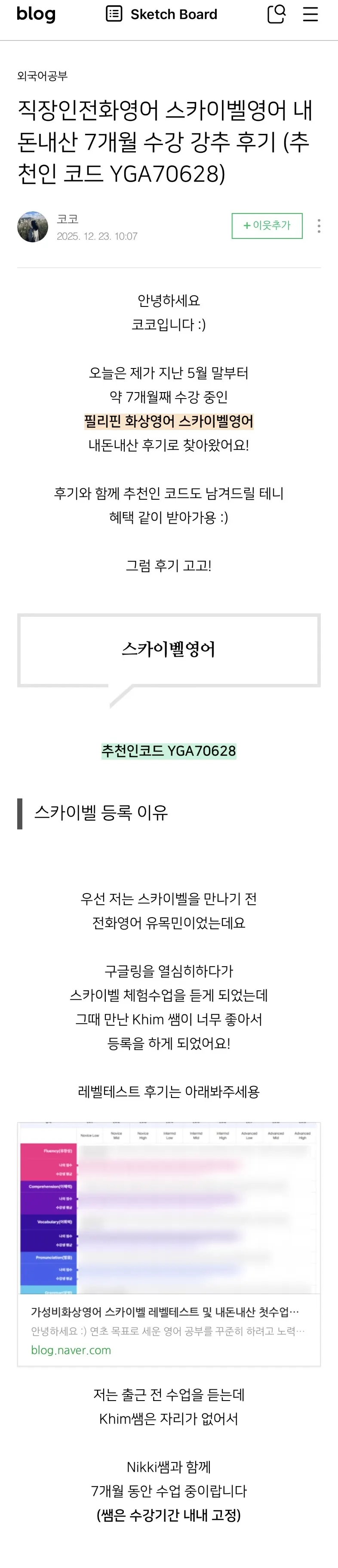오늘은 여러 업체를 경험한 끝에 스카이벨에 정착하여 7개월간 꾸준히 실력을 쌓아오신 회원님의 내돈내산후기를 전해드립니다.