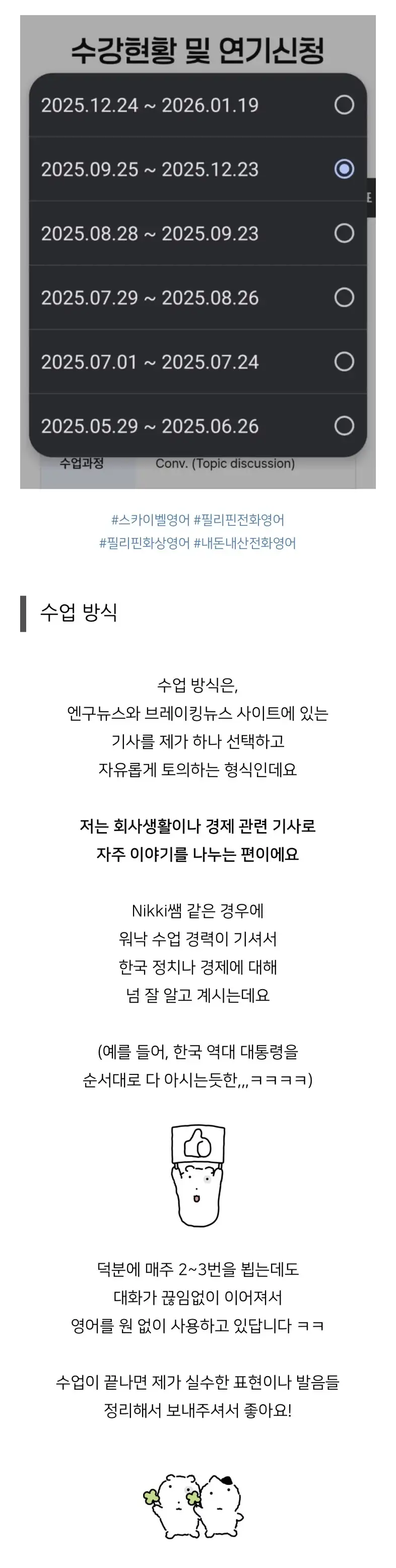 7개월간 한 선생님과 꾸준히 수업하며 깊은 유대감을 쌓으셨대요. 일상 대화부터 경제 이슈 토론까지, 영어를 원 없이 사용하는 환경을 만드셨다는 점이 이번 화상영어후기의 핵심입니다.