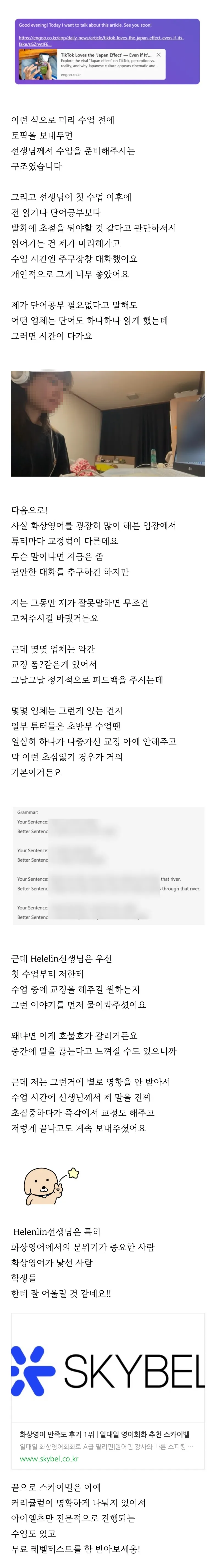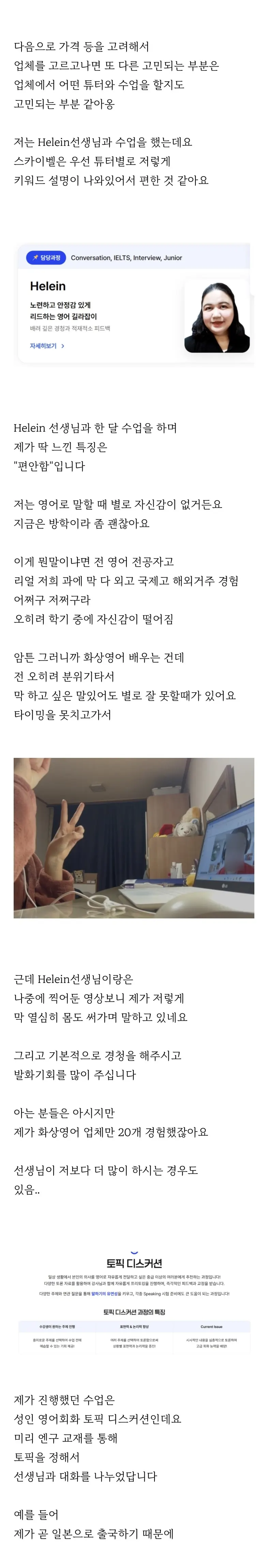 오늘은 영어 전공자임에도 불구하고 자신감을 잃었던 한 대학생 회원님의 이야기를 들려드릴까 해요. 무려 20군데의 화상영어 업체를 경험해 본 분이라 저희 스카이벨의 장점을 아주 날카롭게 짚어주셨습니다.