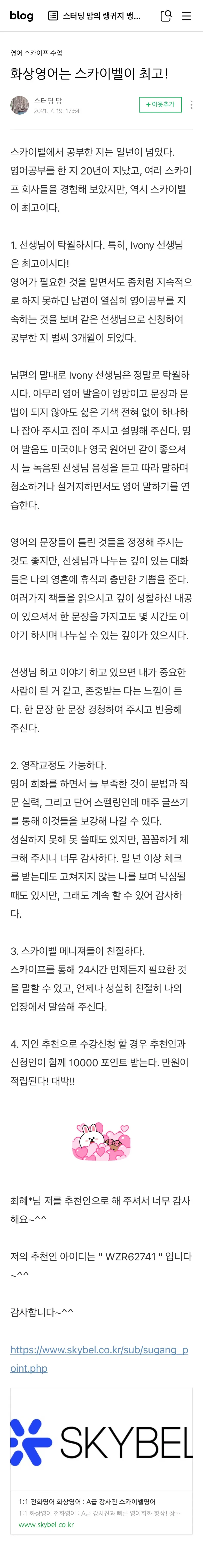 "20년 영어 공부 중 여기가 최고"라는 극찬을 보내주신 회원님처럼, 여러분도 단순한 학습을 넘어 자존감까지 높아지는 경험을 스카이벨을 통해 해보셨으면 좋겠습니다.