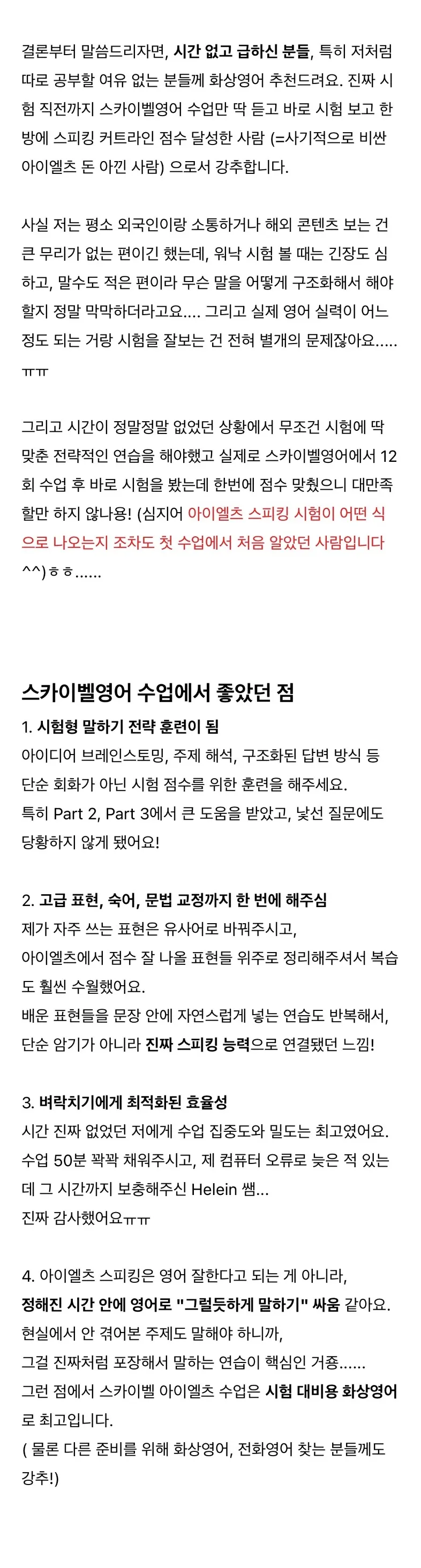 평소 영어 소통에 무리가 없어도 시험장에서는 머릿속이 하얘지기 마련이죠. 특히 Part 2, 3의 낯선 주제들 앞에서 당황하지 않도록 아이디어 브레인스토밍부터 답변 구조화까지 훈련한 것이 신의 한 수였습니다. "그럴듯하게 말하기" 싸움에서 이길 수 있는 포장 기술을 화상영어추천 1순위인 스카이벨을 통해 완벽히 전수받으셨네요.
