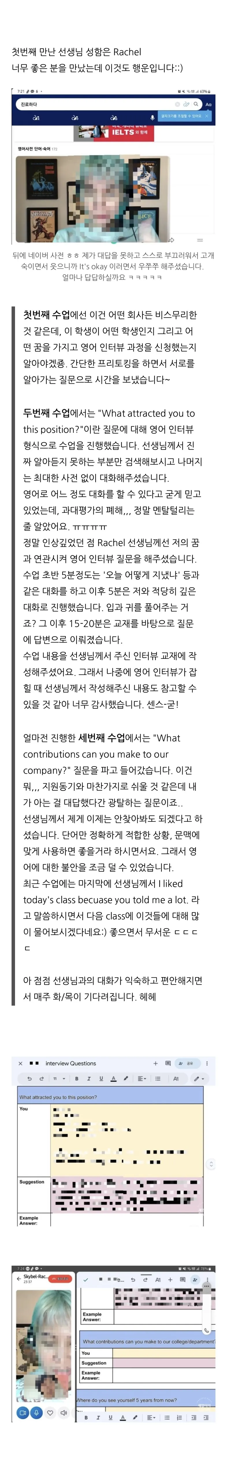 수업 초반 10분 동안 일상 대화와 깊이 있는 스몰톡으로 긴장을 풀고, 나머지 시간을 교재와 인터뷰 실전 연습에 집중하는 루팅 덕분에 효율이 극대화되었습니다. 선생님께서 수업 시간을 훌쩍 넘겨 30분이나 열정적으로 지도해 주셨다는 대목에서 두 분의 환상적인 호흡이 느껴집니다.